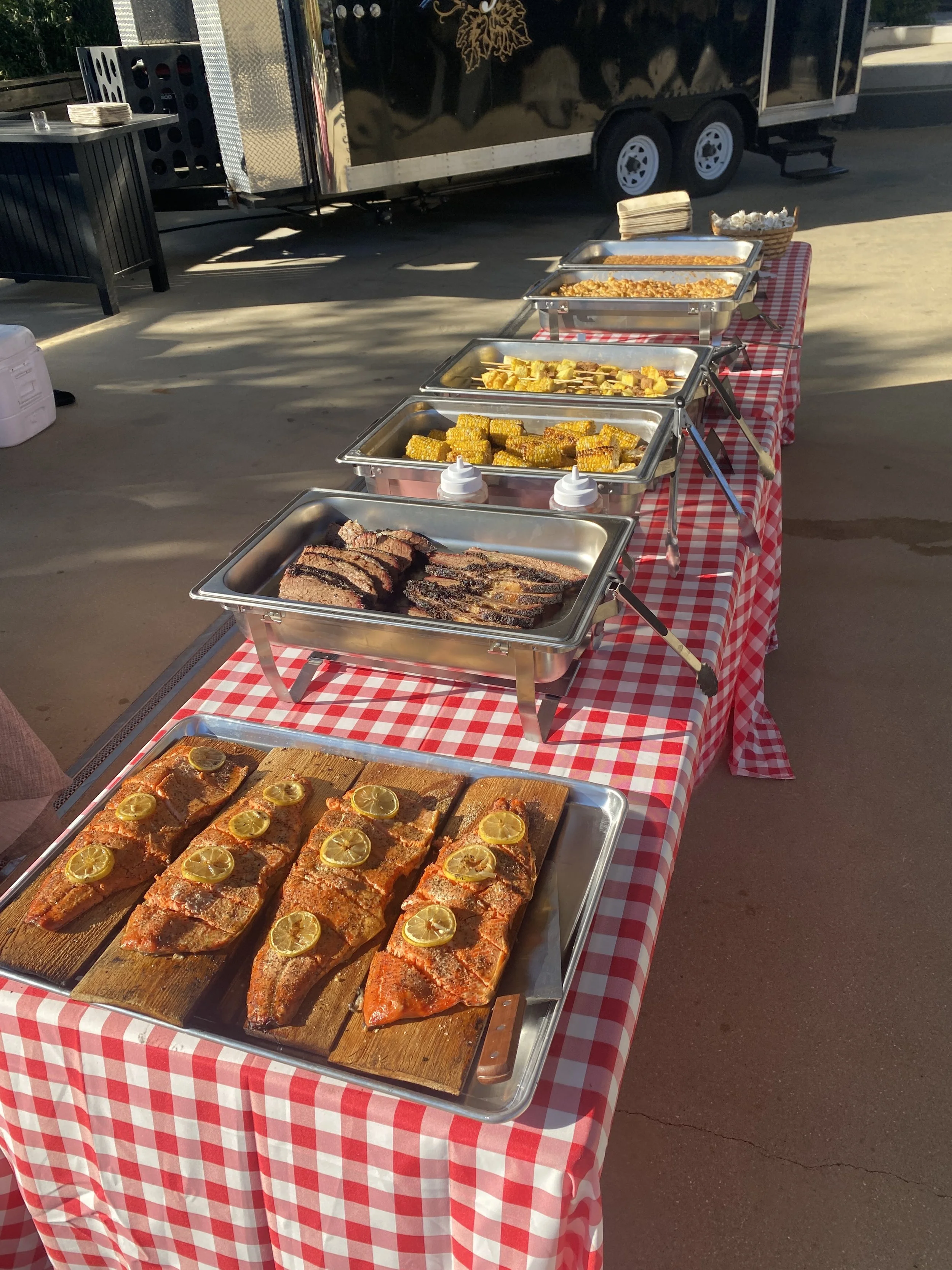 We will craft a memorable dining experience by preparing your meal onsite with our mobile smoker and grill ensuring fresh, flavorful dishes served at their peak. Your buffet setup features sleek, modern presentation.